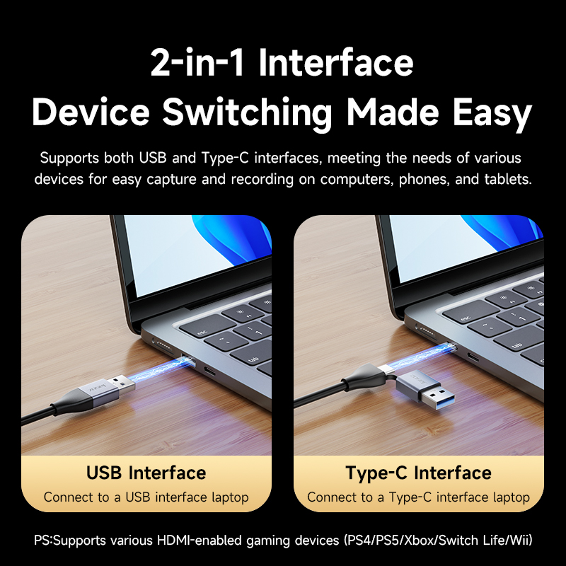 Giao diện HDMI của sản phẩm được kết nối với tín hiệu đầu vào âm thanh và video, và giao diện Type-C+USB được kết nối với điện thoại di động hoặc máy tính để thu độ nét cao, giám sát xem trước video, ghi video, phát trực tiếp video, phát trực tiếp trò chơi, chụp ảnh y tế, ghi video độ nét cao của camera và các chức năng khác;
